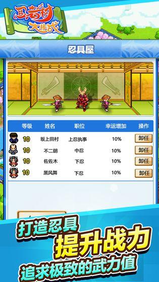 这是一款像素风的忍者时代的模拟经营游戏!! 整个游戏的故事背景如下: 玩家所处的世界,是一个忍者的世界,因为各大忍者村不统一的价值观,以及利益纷争,导致整个世界处于战乱中,平民生活痛苦不堪。 你所在的忍者村,向往和平,并希望能统一忍者村。 但面对几大野心勃勃的忍者村,不可避免的被发生了无数次战斗。 在最近到一次大战中,各大忍者村的首领都因为身负重伤,要么去世,要么隐退。 现在村长的位置传到了你的手里,希望你能重整旗鼓,实现一统忍者村的愿望。 游戏的主要目标: 发展村庄,培养忍者,统一忍者世界!