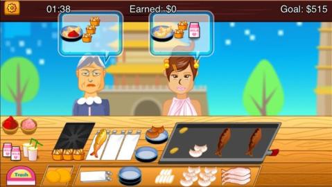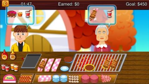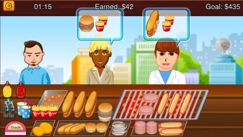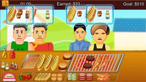 这个游戏非常有趣并且上瘾! 游戏方法是做热狗,挣钱,再烤点汉堡,烤点羊肉串啥的。。。 特点 1. 一共有170个关卡,很好玩的哦~ 2. 有80种类的客人,别惹火他们啊~ 3. 里边有速度模式,在规定时间内疯狂的做出很多美味的食物! 4. 数几十种汉堡和热狗,羊肉串,薯条。。。 5. 适合很多人玩,并且上瘾!