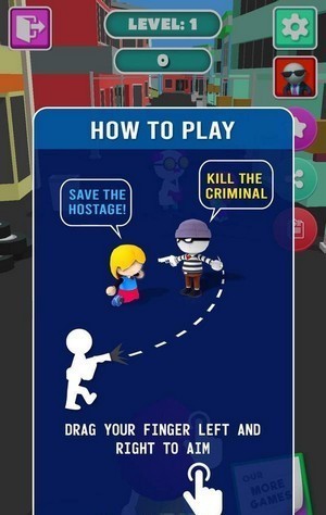曲线子弹射击3D是一款非常刺激的射击闯关类游戏。玩家在游戏中将使用一把独特的枪械进行闯关。这把枪射出的子弹是可以进行漂移的,让你的子弹绕过人质,集中后面的劫匪,最终拯救出人质。游戏的卡通画风,以及3D的场景设置,都是非常的有趣的,给人一种奇妙的闯关体验。感兴趣的朋友一定不要错过,快来下载试试吧。