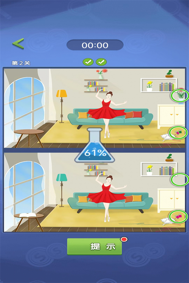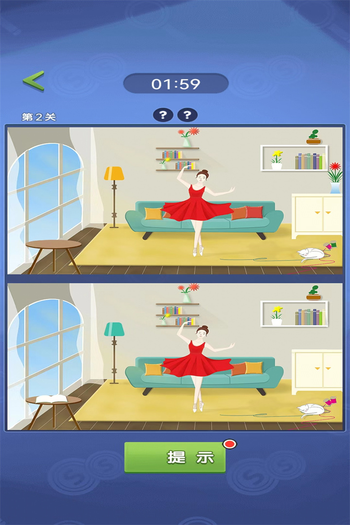 游戏类型:免费离线休闲益智游戏 游戏玩法:必须找到两张照片之间的不同来,每个关卡会有5个不同,在规定的时间内找出所有不同,游戏过关,否则游戏失败。 游戏特色: •超过300关卡的找茬,总计1500多个不同! •自动保存游戏进度,包括所有已经找到的不同和差异,让你随时随地想玩就玩,想停就停!