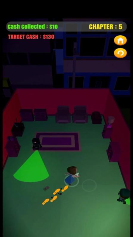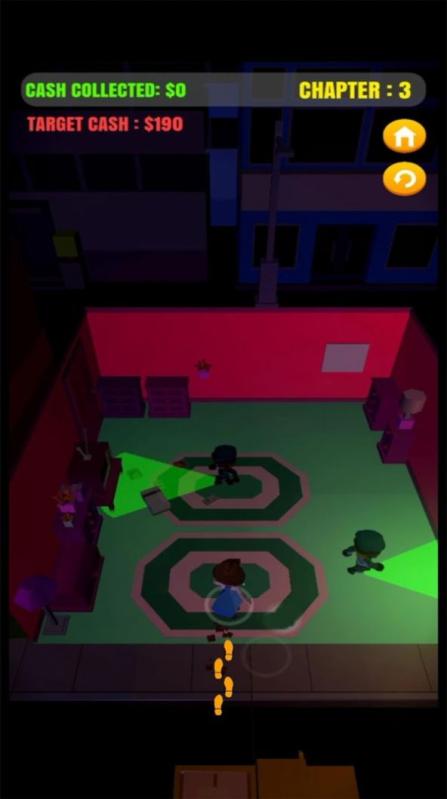 疯狂强盗大师游戏是一款模拟逃脱类冒险手指游戏,游戏中玩家将装扮成为一位盗贼,在偷到了珍贵珠宝文物之后需要躲避警察的搜查逃出去,游戏中每一次的逃脱环境都不相同,玩家在游戏中需要优先观察不同警察的移动规律和视野范围,找准时机快速向出口移动。 疯狂强盗大师游戏特点: 1.游戏的操作非常简单,通过手指滑动玩家就可以控制自己的角色上下左右的进行移动或者躲藏到一些掩体后方; 2.游戏中不同的场景中警察的巡逻方向和规律都是不同的,但是总是会有一点机会来让玩家可以不断的向前走; 3.建议玩家进入关卡后优先进行观察,找准警察们的规律之后然后再进行行动,尽可能躲藏在警察的视野范围之外。 疯狂强盗大师游戏亮点: 1.游戏中玩家在移动之后会留下存在一定时间的脚印,在警察发现脚印之前玩家需要尽快移动到安全的位置,避免警察转动视角发现了; 2.场景内有的时候会存在一些可以遮挡视野范围的物件和箱子,玩家可以利用这些物件来制造视野盲区或者藏在里面等待时机; 3.游戏中玩家面前的箭头可以指出玩家角色的移动方向,玩家可以根据自己的移动方向来估计会不会被发现。 游戏简评: 作为一款益智逃脱类游戏,游戏的整体难度不高,玩家可以利用场景中的各类道具来进行躲避和隐藏,通过不断地找寻前进的时机来完成关卡的挑战,随着玩家游玩的深入,玩家逃脱的时机会越来越短,玩家需要更精准的操作来完成挑战。
