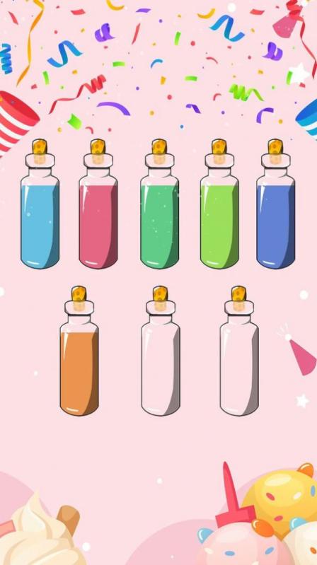 液体分类解谜游戏是一款考验你自己分类的趣味闯关手指游戏。游戏中有着很多不同的液体,你自己需要将这些不同的液体全部都正确的分类,让这些液体都可以在正确的位置。你自己可以在游戏中不断的尝试,整个游戏中将没有任何的限制,快来尝试一下吧。 液体分类解谜游戏介绍: 游戏中的液体有着不同的颜色,红色,蓝色,紫色等等,这些不同颜色的液体全部都需要你自己正确的分类。这也是一款轻松而具有挑战性的游戏,可以训练您的大脑。 液体分类解谜游戏玩法: 1.点击任意一个玻璃瓶,将水倒入另一个瓶中。 2.只有将水链接到相同的颜色并且玻璃瓶上有足够的空间时,才可以将水倒入另一个瓶中。 3.您随时可以随时重新启动关卡,整个游戏没有任何的限制。 4.游戏中你自己也可以自由的选择不同的游戏难度,新手也可以轻松掌握游戏。 5.全部的游戏关卡都是免费的,你自己可以自由的解锁任何的游戏关卡。 游戏特点: 1.简单的分类游戏,可以真正的考验你自己的思维灵活。 2.几百个不同的游戏关卡全部都可以免费的解锁挑战。