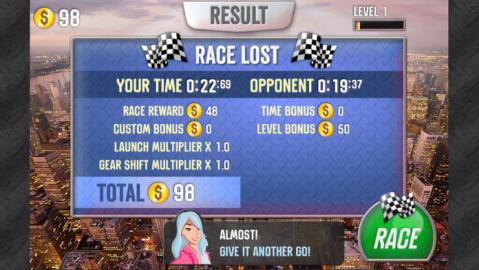 点击进行驾驶,当指针在绿色区域时,点击右侧的箭头即可加快速度。 驾驶你的赛车参与这场超强马达赛车吧!在比赛中升级你的赛车装备购买更强大的赛车,赢得这场比赛最终的胜利吧!