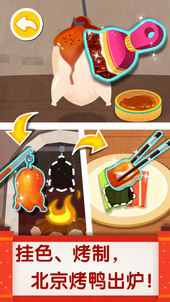 北京烤鸭的制作过程充满讲究:先刷上糖水,再挂在壁炉烤制。注意,出炉后要先用扇子扇几下,冷却下鸭子......对“片鸭”的刀工也有高要求——宝宝必须保证鸭肉热腾、鸭皮酥脆地一整片切下来,搭配葱丝、黄瓜条,卷在薄饼里,蘸上甜辣酱,地道烤鸭出炉。