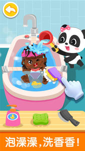 给妹妹洗澡啦!妹妹脸上可脏了,要拿毛巾擦掉污渍!头发也脏兮兮,用洗发露搓出泡泡,能洗得更干净。别忘了洗手洗脚,赶跑细菌哦!