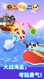 出发寻宝咯!遇到暴风雨怎么办?宝宝驾驶船只,躲避海上障碍,朝着避风港,加速前进。遭遇海怪攻击?拿起炮弹,瞄准、射击,驱赶海怪。抵达宝藏岛,神秘宝藏在哪里?敲开石头挖挖看!