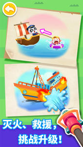 伙伴们掉进水里了,宝宝能帮助它们嘛?扔出救生圈,就能救起它们。看,有船只起火,快使用消防泡沫,扑灭大火。人鱼公主被困,宝宝化身小骑士,剪开海草,解开铁锁,救出公主!