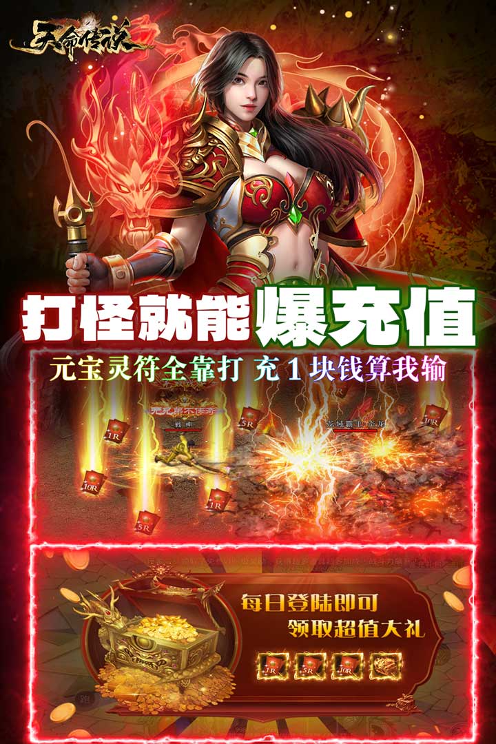 《天命传说》是一款经典武侠传奇打金手游,上线即可免费领满VIP,首冲免费送,打怪就能爆真充,不肝不氪,散人也能玩转传奇。