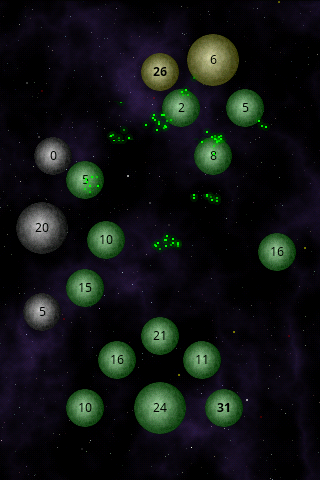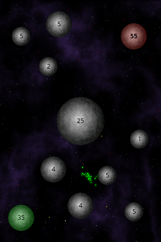 游戏玩法:就是看谁的星球上飞船数量更多,触屏操作,把你基地星球上的飞船发射到另外一个星球上,你可以选择直接发射到敌星,也可以通过中间其他星球跳转,有点考验智力了,然后用飞船的数量优势占领所有星球,win。