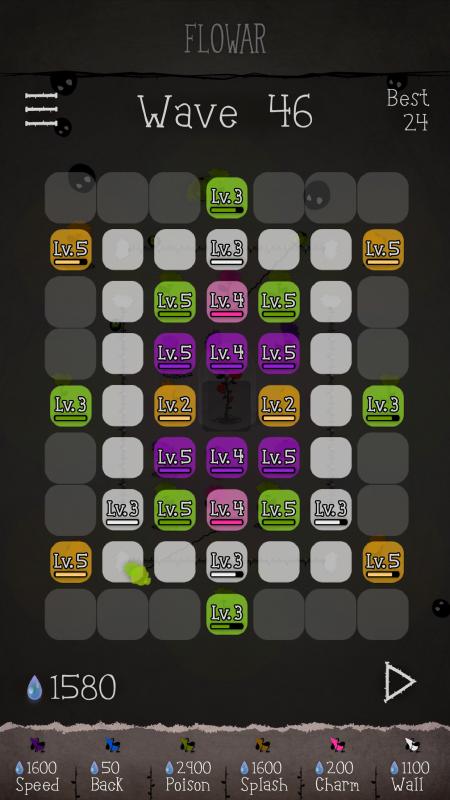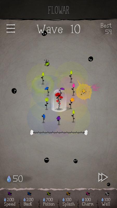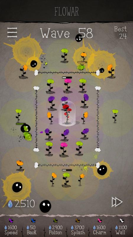 《花》(Flowar)是一款类似植物大战僵尸的策略塔防类游戏,不过这次我们保护的不是人的脑子,入侵的也不是僵尸,我们要做的就是让美丽的玫瑰不受到伤害。进入游戏会有基础的教程。相比其他塔防游戏,本游的特色在于:没有固定路线,没有确定的出怪方向,作为防御塔的花甚至作为障碍物的花墙都具有“生命值”,会被敌人碰撞消减以致凋零。游戏中每10关会有一次类似于boss关性质的关卡,主要敌人是四个相对十分巨大的黑色毛线团怪。想要通过的较为轻松需利用好粉花的控制作用。如有可能,请在进入此类关卡前留一定的“水”来在过程中为花补充“生命值”。