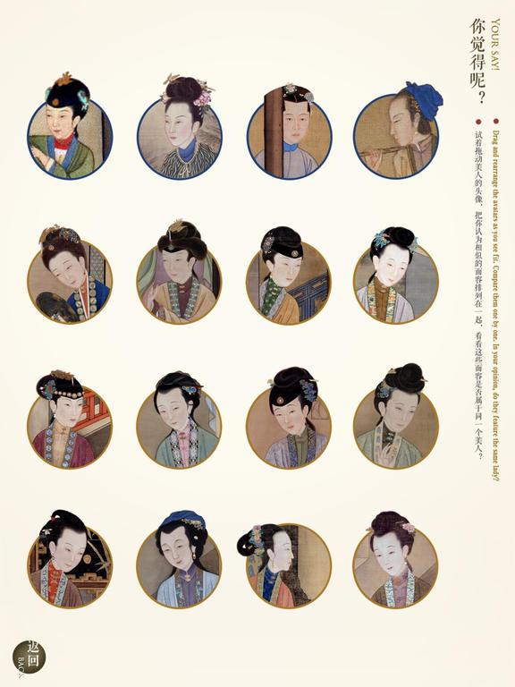 《胤禛美人图》是故宫博物院出品的休闲游戏,让您指尖轻触,从十二幅美人屏风画像一窥清朝盛世华丽优雅的宫廷生活。游戏主体是九幅立轴画卷展现,伴随着悠扬典雅的乐声,用户可以观赏《胤禛美人图》的作品细节。画面不但可以全屏观赏,也可以用“鉴赏”模式激活一个虚拟的放大镜进行细节观赏;每一幅图片还带有画面构图以及绘画的鉴赏文字,喜欢的玩家快来试试吧!
