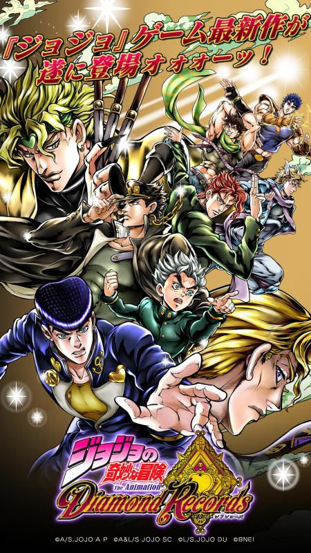 《JOJO的奇妙冒险:钻石纪录》(ジョジョの奇妙な冒険:ダイヤモンドレコーズ)是一部改编自《JOJO的奇妙冒险不灭钻石》的动作手机游戏,游戏中《JOJO的奇妙冒险》1-4部的主要角色都会登场,玩家可以结成自己喜爱的梦幻队伍进行冒险。本作的主线故事为动画内容的追加体验,玩家可以从游戏中从新领略动画中的经典场面。