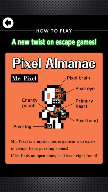 A new evolution of escape-the-room games! Clear each room and escort Mr. Pixel to victory! Plus! A speedrun mode with global rankings! Art, sound, and game design: SKIPMORE Programming: URARA-WORKS Co., Ltd. Translation: NEP Ver1.0.8 - 1.0.9 - Fixed bugs. Ver1.0.6 - Fixed Room12 Ver1.0.5 - Fixed tweet bug. Ver1.0.4 - Fixed bugs. Ver1.0.3 - Fixed the room21 for some devices. Ver1.0.1-Ver1.0.2 - Fixed bugs.