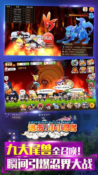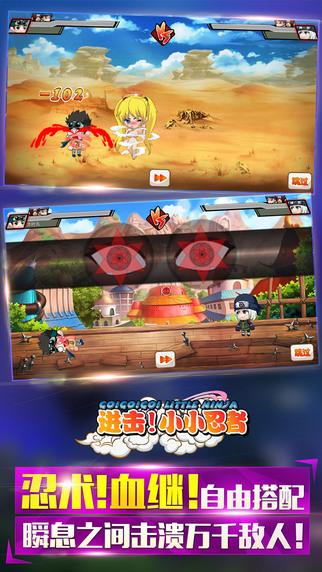 2015开年最萌忍者手游!忍者村养成计划:《进击!小小忍者》萌动上线! 付费榜超福利发放,所有付费1元下载的玩家均可获得“千鸟礼包”(礼包内包含:S级技能卷轴千鸟*10、金币*50、体力*20、银币*50000)。 【上架限时活动】 活动名称:双重登陆奖励之每日签到 活动内容: 天天登陆领取丰厚奖励,周周送高级忍者、装备,总奖励高达万元金币。 活动奖励: 见游戏内每日奖励页面。 活动名称:双重登陆奖励之七天好礼 活动内容: 新账号前七天登陆都可领取丰富奖励,限时好礼等你拿! 活动奖励: 第一天登陆奖励:体力*50、B级忍术卷轴*10、银币*50000 第二天登陆奖励:金币*50、B级装备箱*1、A级忍者卡片箱*10 第三天登陆奖励:体力*50、A级忍术卷轴*10、银币*100000 第四天登陆奖励:金币*50、A级装备箱*1、A级忍者卡片箱*10 第五天登陆奖励:体力*50、A级忍术卷轴*20、银币*200000 第六天登陆奖励:金币*50、A级装备箱*2、A级忍者卡片箱*10 第七天登陆奖励:体力*50、S级忍术卷轴*10、S级忍者卡片箱*5 【小小忍者邀请你体验2015年首款诚意忍者游戏】 《进击!小小忍者》用轻松可爱的画风完美还原忍者大陆。上百位人气角色悉数登场,生动的人物表现让你告别卡牌式的呆板!高度还原漫画中的忍术、血继、通灵,更有超多类型的小游戏 挑战你的脑力极限。在《进击!小小忍者》里不只有你一个人,为了守护你心爱的人而战!成为真正的忍者吧! 【特色玩法】 超人气忍者悉数登场! 多线培养打造最强忍者:忍者、技能、装备多线养成绝不枯燥。 创新小游戏挑战手指极限:拉面打劫、材料夺宝、忍界大战让你High翻手机。 萌萌哒风格让人爱不释手:搞笑对话、超萌剧情让你体验不一样的忍者世界。 忍者忍术五属性全面开放:水、火、土、风、雷属性相生相克更具策略玩法