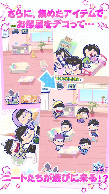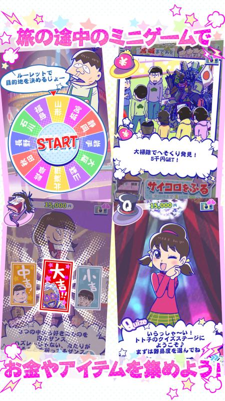 大人気アニメ「おそ松さん」に登場する6つ子たちと 日本を旅するゲームが登場! 6人のニートたちと日本を旅して、目指せ億万長者!? ◆物語の始まり◆ 今日も6つ子たちは、やることもなく家でダラダラと過ごしていました。 すると、なんとなくつけていたテレビから驚きのニュースが流れてきたのです。 『東京都に1年間で届けられたの落し物は33億円』 …道端に33億円もの大金が落ちている!?しかも東京都だけで!! これは、全国に落ちているお金を拾い集めたら億万長者も夢じゃない!? そう思い立った6つ子たちは、それぞれの野望のもと 日本全国、金集めの旅にでるのでした。