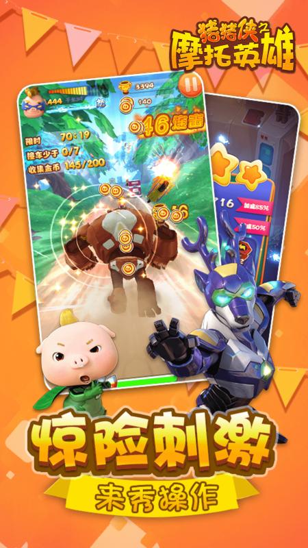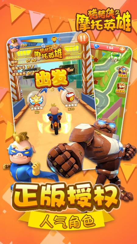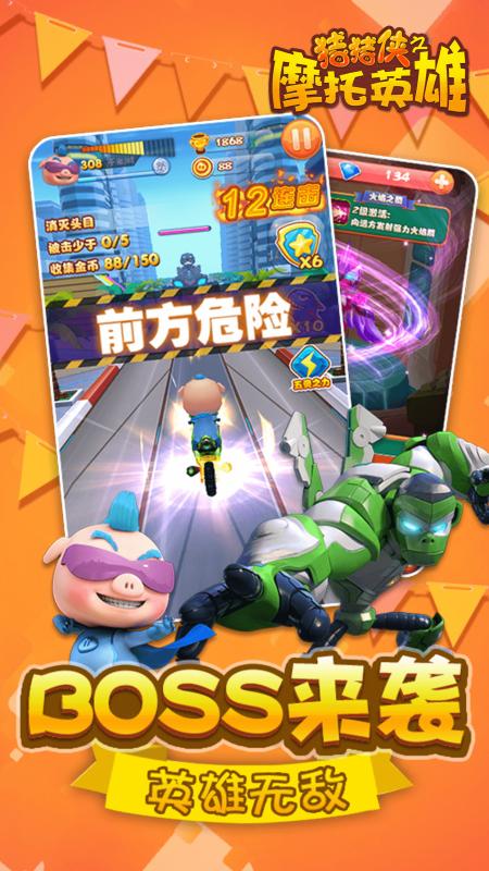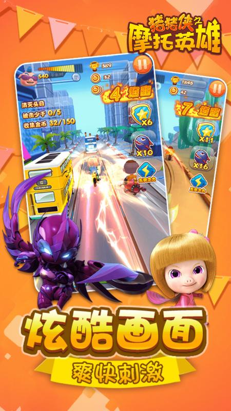 《猪猪侠之摩托英雄》超人气动画正版授权的竖版3D摩托竞速游戏!超人气动画角色和酷炫的角色变身,百分百还原!猪猪侠大电影《猪猪侠之英雄猪少年》联动活动率先开始!参与游戏,即可有机会获得猪猪侠大电影票,还有神秘精美礼品和限量版电影公仔! 猪猪侠、超人强等5位超人气角色,驾驶着酷炫的摩托车飞驰狂奔,打倒一切拦路的敌人!超车攻击一气呵成,疯狂连击停不下来!为了抵挡强大的神秘人,猪猪侠和同伴们变成无敌强大的五灵卫形态,使出强力酷炫的秒杀技能,破坏所过之处一切障碍!和未来决一胜负吧!