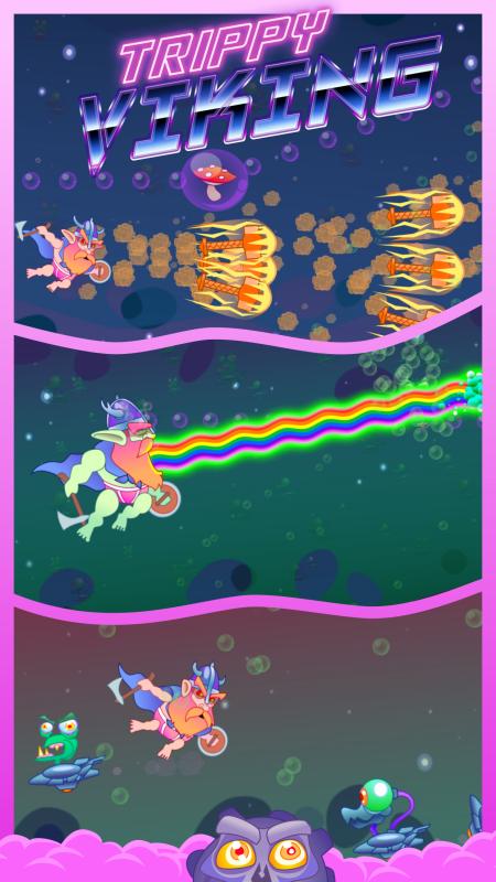 《迷幻的维京人》(Trippy Viking)是一款横版射击游戏。在游戏中,玩家可以控制角色上下飞行,同时发射子弹射击屏幕右方的敌人。玩法比较普通,但画风奇特,控制的维京人甚至可以从嘴里喷出彩虹来击杀敌人。喜欢的玩家可以尝试一下。