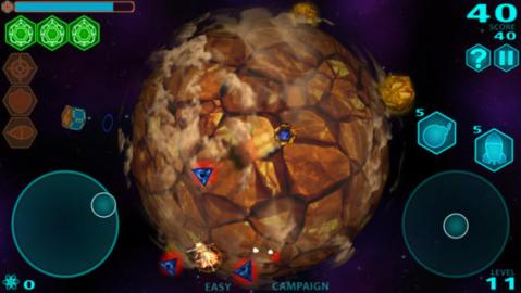 这是一款非常酷的3D太空射击游戏。你的飞船将绕着不同的小行星飞行,简单的触屏控制,你要做的是摧毁小行星,使用枪支,炸药去终止不同的敌人,收集奖金和令牌升级装备。18个关卡,6个不同的小行星,真棒的三维图形,当然随着关卡的进行,游戏的难度也不断地增大,也给玩家带来极具挑战,游戏还分为运动和街机两种模式,支持游戏中心的成就和排行榜,快的太空战体验。