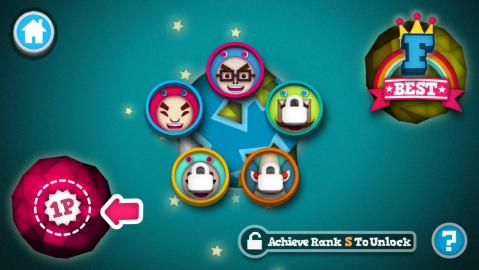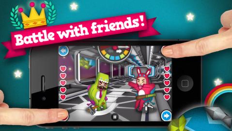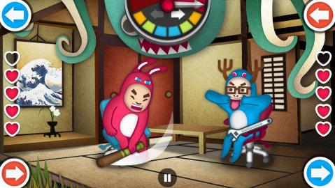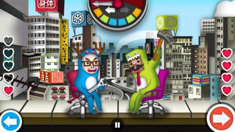 这是非常有意思的双人游戏,游戏玩法和我们小时候做的小游戏类似,两个小伙伴一人一张椅子,各拿一根棍子,找裁判数数,谁反应慢被敲中,就算输,而游戏基本就以这样的方式进行,屏幕顶部有一根指针,会以或快或慢的频率摆动,最后会猝不及防地偏向一边,然后就可以根据指针的方向,点击屏幕下方同方向的按钮,进行击打或闪避。游戏难点在于这指针的摆动频率,如果提前按方向按钮(没敲定最后方向),角色就会晕,如果指针敲定了方向还没动作,那也会被敲,失去一点血,所以要诀就是反应要迅速,紧盯那摇摆不定的指针。游戏支持双人同机,左侧和右侧各有一组前后按钮,玩法和单机基本一致,指针摆动照样神鬼莫测,猜也猜不到,谁先被敲到空血,谁就算输,非常适合朋友家伙或情侣一起游戏。