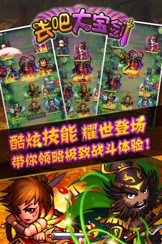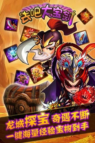 《去吧大宝剑》是一款以精心打造的Q萌搞怪式卡牌游戏。精美的游戏场景、个性的人物画风、强大的战斗特效,更有高星级武将“打包”抽取!特色“奇遇”探索系统,一键遨游,获得海量宝物和经验!让你和你的小伙伴们,爽得不要不要的!