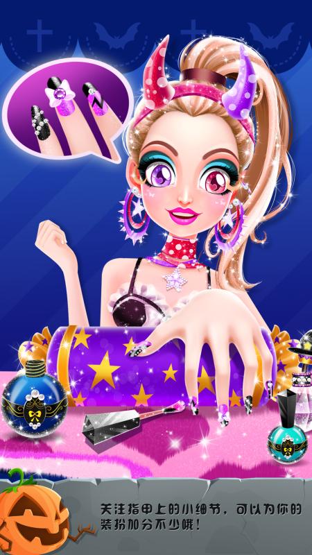 《艾玛的疯狂之旅-万圣节》是一款养成类化妆游戏。打开游戏,进入房间。进入美甲活动,先挑选一个适合自己的指甲形状,然后选择每一只手指,涂抹指甲油、选择合适的图案、贴纸、水钻。如果觉得不喜欢也没光系,可以用卸甲水卸掉后重新涂抹。每一只手指涂抹装饰完毕后别忘了选择好戒指然后进行拍照。然后我们来到下一个活动——化妆。拖动工具在脸上进行细细的绘制,要有耐心哦,美丽精致的妆容就会慢慢呈现出来。最后我们来换装吧!这里有非常多的服饰供你挑选哦。将你心中想要扮演的角色打扮出来吧!