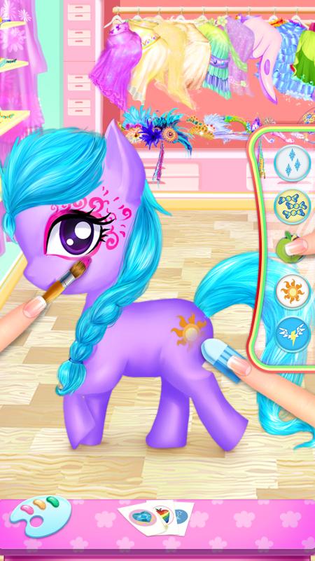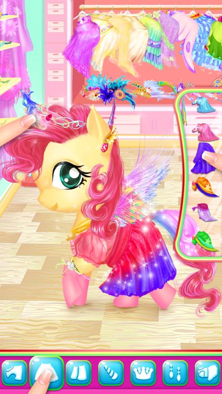 今年最火的卡通人物魔法小马来啦!你是不是做梦都想有一匹属于自己的小马呢?在这个彩虹的世界里,你可以自由为你的小坐骑装扮换装,还能拥有魔法的力量!你需要帮小白马做一个美容,要帮它洗的干干净净的,别忘记给它打扮漂亮了。小马也是有很多花衣服的哦!操作非常简单,根据游戏提示,合理操作即可。快来把魔法小马打扮得更加漂亮吧!