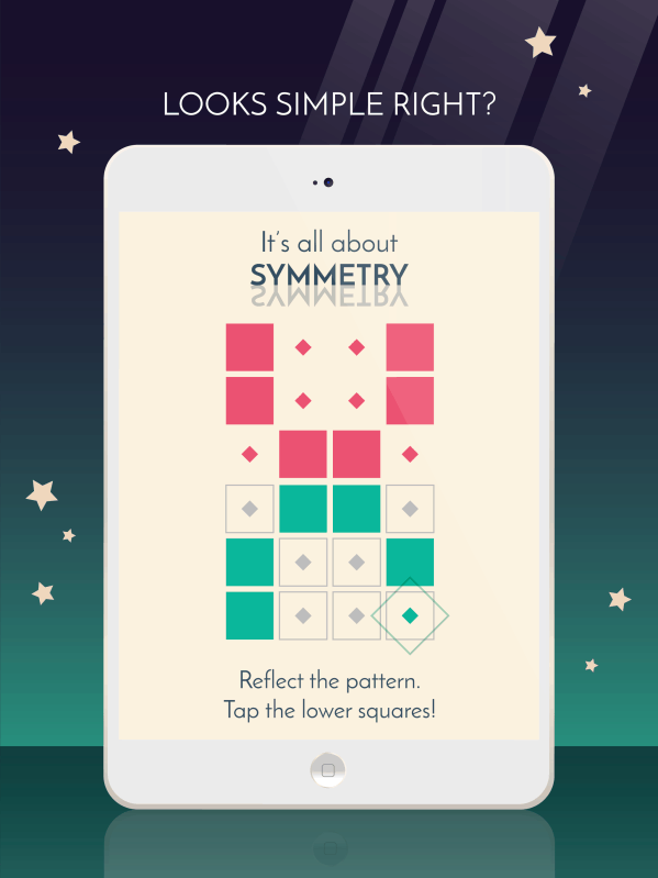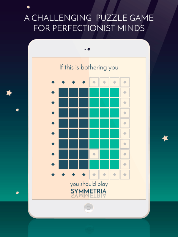 Symmetria is a fast-paced puzzle game about symmetry. A simple yet challenging exercise for perfectionist minds. Why did we create Symmetria? There’s a little itch lurking inside all of us. A little itch that makes us do weird things. Weird things like… avoiding to step on floor tile lines, eating M&Ms in strict color order or becoming mad because that stupid text box won’t align pixel-perfectly. And… that little itch just LOVES symmetry! Symmetria was made to render that strange, yet universal satisfaction that produces symmetry as an elegant, challenging and simple game, always handily waiting in your phone for when your little itch craves for a little reward :) -------- FEATURES -------- - Tap the squares to reflect the pattern, like a mirror! - Horoscope Constellations available w/ +75 levels & different game mechanics! - Battle your friends in the 2 players - 1 device Mode! - Survival Endless Mode - Game Center leaderboard and achievements - Color blind mode, everyone should be able to enjoy Symmetria :) - Train your brain & improve your visual-spatial ability while playing! #HINT: You can upgrade to Symmetria Premium to get rid of ads and have access to all the content this game has to offer :D *No internet connection needed. This game is made by a 2-person team so we really appreciate your feedback ^-^ -------- INFO -------- We really hope you enjoy our game! We certainly had a blast making it. Even if you didn’t, we’d love to hear from you. Email our support team at info@platonicgames.com Youtube Channel: https://www.youtube.com/channel/UCy0dXJ1QlvypstMP-Nw57RQ Follow us on Twitter! https://twitter.com/PlatonicGames Like us on Facebook: https://facebook.com/PlatonicGames If you have a little OCD inside you, you may enjoy playing Symmetria :) - Color blind mode added, because everyone should be able to enjoy Symmetria :) - Fixed Game Center: It's ok now, you can keep bragging about your scores online! - Lots of bugs fixed: will you please stop breaking our game now? ò_o
