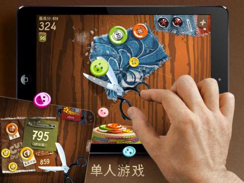 这是一款多点触控的休闲小游戏。精美清新的画面,带你走入心灵手巧的剪纽扣世界。你要用你的手指来控制一把剪刀,让纽扣完美的落入制定的容器中。(仅仅一个手指是远远不够的哦!)游戏没有冗长的介绍,没没有繁琐的背景故事,一切都很简单,特别容易上手,很适合消磨时间哦!剪!剪!剪!快来剪纽扣吧,如果一次减掉三个或者更多的纽扣就可以得到高分哦,所以你还要用一点小聪明,看看怎么用最少的动作剪掉最多的纽扣!小心你的指甲,那会影响你的发挥哦。无需太用力,不同于现实的剪刀,只要轻轻滑动,纽扣就松了!
