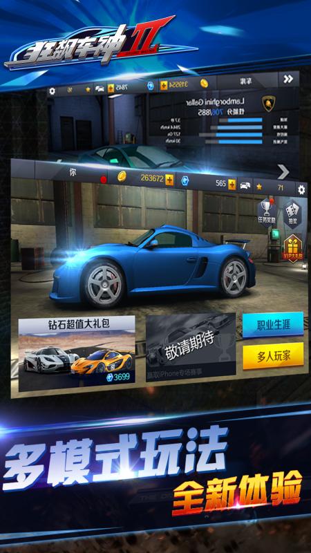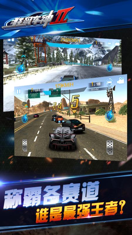 《狂飙车神II》是一款极速赛车类的体育竞技游戏。游戏易于上手,速度流畅。游戏内云集了各款经典豪车,精美的画面,丰富的道具,变化多样的赛道,令玩家深深的陶醉在超爽的竞速体验之中,游戏体验感细腻,性能优越而流畅,加之动感振奋的音乐,使得玩家可以畅所体验游戏!《狂飙车神Ⅱ》有多种操作模式和多种视角,途中有多种车辆干扰形式,需要随时变换车道,可以通过手机重力感应操控赛车方向,也可以设置成手动控制方向,让玩家在游戏中有身临其境的感觉!全新的游戏画面,舒适的操作手感,刺激的赛车竞速,完美的过弯体验!您还在犹豫什么!快来尝试吧!
