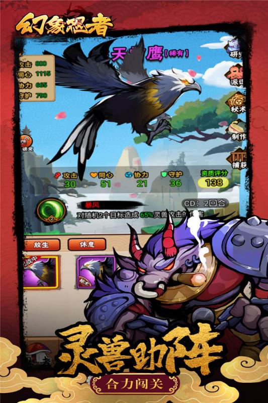挂机拿收益,上线打Boss,2020新款放置冒险手游《幻象忍者》轻松来袭。不必困扰于浪费时间与精力的爆肝,抛弃按到手软的繁复操作。只需一键,带你体验华丽战斗!幻象合体,灵兽助阵,菜单内设置技能释放顺序,游戏中一键释放,告别所有重复操作,体验纯净的忍者冒险。