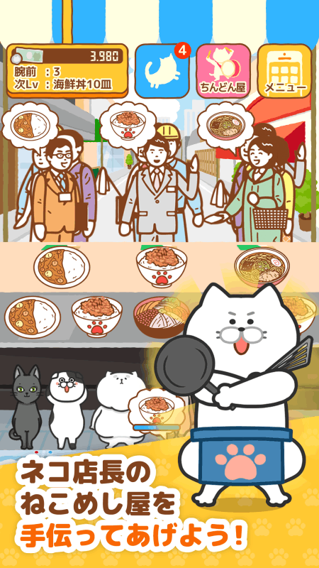 日本著名游戏发行厂商Tamtam公司,推出的一款主打猫咪模拟经营类的手游《猫饭屋》(ねこめし屋)。本作是模拟经营类的手游,玩家在游戏当中将会扮演一名看起来并不可靠的猫咪店长,并且帮助他经营自己的小吃店。玩家在游戏当中能够雇佣临时工,并且与各种有趣的客人打交道。同时玩家在游戏中可以雇佣不同风格的猫咪临时工,让他们帮助来招待各种人类的客人,然后赚取丰厚的利润,然后装修发展店铺。 ねこめし屋を遊んでくれてありがとうฅ(○•ω•○)ฅ ・同じネコッターが何度も出てくる不具合を直したよ ・以前のアップデート内容はねこめし屋公式サイトをみてね