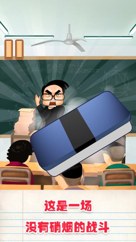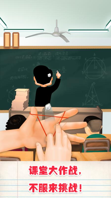 ※本游戏纯属娱乐,请勿在现实中模仿※你是否曾讨厌上某个学科老师的课?你是否曾在课堂上做一些小动作?是否想过在课堂上与老师来一场纸团大战?这款游戏就能够满足你的欲望~游戏规则很简单,点击弹纸团按钮来发射纸团,打到讲台上后要注意老师的动作,若老师有所察觉请立即点击另一个看书按钮来防止被老师发现,弹射的纸团越多分数越高,千万不要被老师发现是谁干的,不然你就惨了。。。友情提醒:本游戏以娱乐为目的,请不要在现实课堂中模仿,否则我也救不了你。