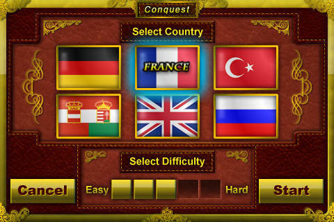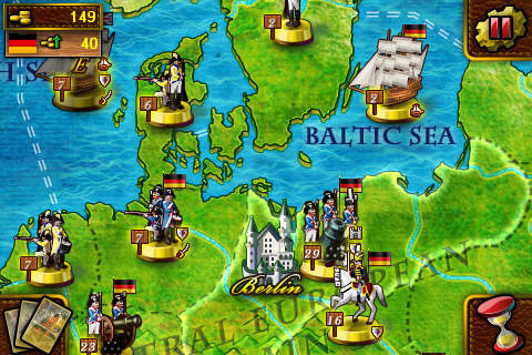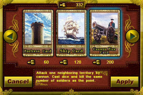 European War (musket & artillery) is a new style strategy game for iPhone & iPod. It takes you to battleground Europe during the eighth century and nineth century. In this game many tactics been used in order to defeat the other forces. You can select six empires: British, French, Ottoman, Russia, Germany and Austro-Hungary in this age. If your army conquest enemy’s territory your total tax revenue will be improved. You would get all of the empire’s Territories and improve yourself total tax revenue after your army conquered enemy’s Capital. Tax can be used to purchase cards (Draft Card, General Card, Marshal Card, Ship Card, Fortress Card, Cannon Fire Card.)