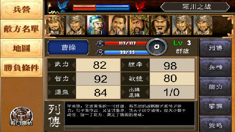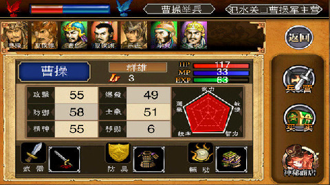 经典策略战棋游戏,"三国志曹操传"完美再现,开放全部58个关卡,红蓝两条剧情线,治世之能臣还是乱世之枭雄任你选择。
