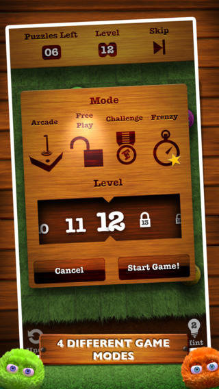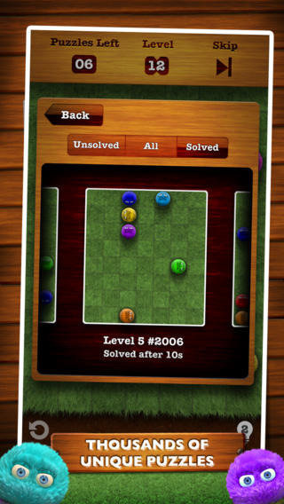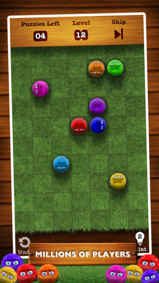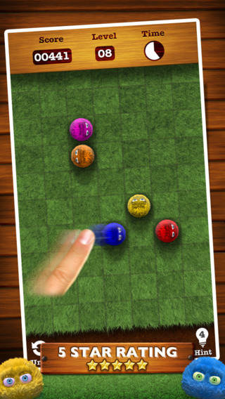 Each puzzle has a single, unique solution, and is solved by simply flinging (pushing) the furballs, and watching them bump each other off the edge of the screen, until only one is left.