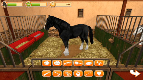 In the stall you'll learn a lot about grooming your horse. You can currycomb, brush and pet your horse. The hooves must be cleaned and the stall needs fresh straw. It's all possible by touching the touchscreen.