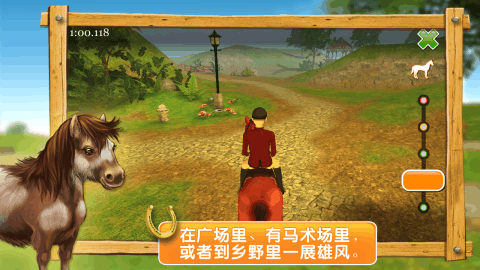 After you've groomed your horse, you'll get a riding lesson. In the course you'll show your skill at riding, try to follow the riding line as closely as possible and thereby try to achieve the best time.