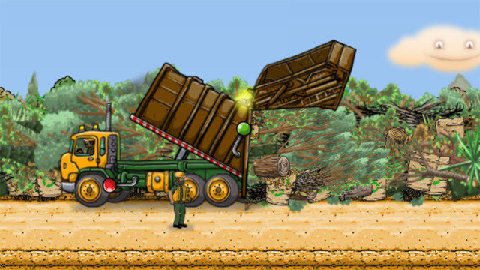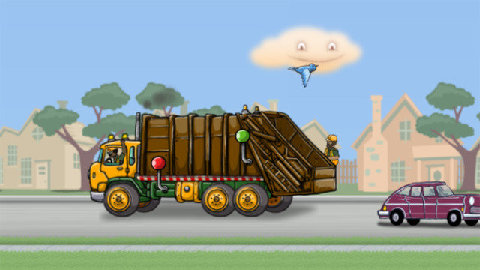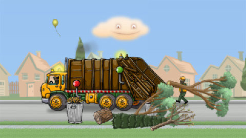 Ride along on a Brushy Pick Up Garbage Truck as it drives through a neighborhood and stops to pick up limbs, brush, stick bundles, leaf cans and lawn bags. Pick up the brushy items yourself and drag or drop them into the hopper. Tap the garbage man to have him help pick up the brushy items also. Use the green knob on the side of the truck to operate the truck's compactor to squish the garbage. After three pick ups, visit the Compost Site to empty the truck! Then drive the Giant Compactor Truck to mash down a huge pile of brush!