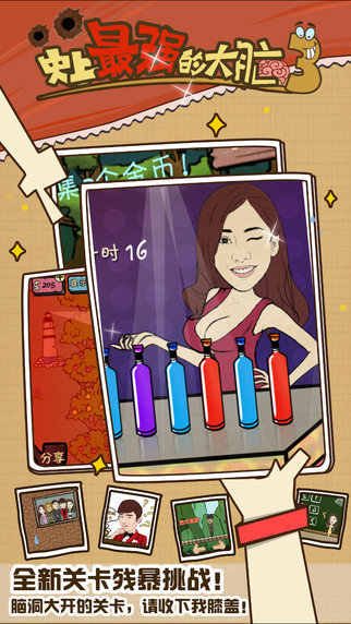 玩过了《史上最坑爹的游戏》,脑子还没长进,怎么办?别急,“史上”家族又增一新游——《史上最强的大脑3》,绝对又是让你意犹未尽又爱又恨心痒手痒各种痒。这游戏名字也许让你联想到了《最强大脑》的综艺节目,尽管没有计算难度惊人的中国雨人,也没有让妹子尖叫的都敏俊xi偶吧,但小编我保证,只要你开始陷入这个游戏大坑,哪怕有千方百计也难以阻挡你要绞尽脑汁拼死要通关的心。