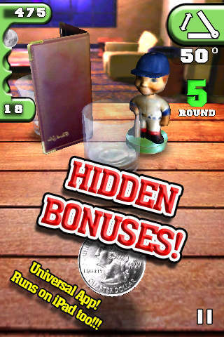 iQuarters combines realistic physics, strategy and surreal trick shots with the timeless art of flicking change. The goal is simple: flick a virtual quarter into a glass to advance through different levels. Control the shot with your index finger or thumb to send that silvery-pixeled Washington flying through the air.