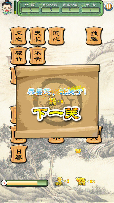 清新淡雅的中国风,游戏让您在古韵中寓教于乐、陶冶情怀。适合各个年龄段的玩家在娱乐中丰富自己的知识,与家人、朋友一起来比赛看谁成语词汇量更大、眼力更敏锐吧!