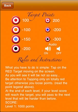 The goal of the game is to hit with your finger the greatest number of red target that will appears on the screen.