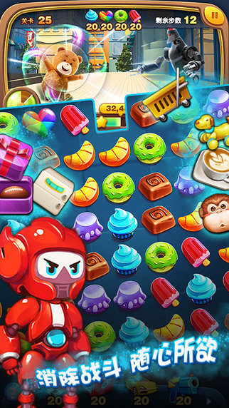 《泰迪爱消除》是由泰迪熊正版授权的一款三消类休闲游戏。游戏紧贴《泰迪熊》电影剧情,通过控制三个主角泰迪、小飞和罗巴,一起粉碎巫博士通过控制机甲玩具征服世界的阴谋,并以爽快流畅的消除手感,绚丽缤纷的消除效果,独创的微策略闯关玩法,趣味与挑战并存的关卡,突出主角特色的养成系统,加上清新诱人的美食风格以及泰迪熊电影原版音乐和配音,带给玩家高品质的动感消除体验。