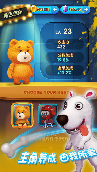 游戏在传统的三消基础上,引入了角色养成玩法和战斗系统,让整个游戏过程更加丰富多彩。除了泰迪、玩家还可以培养如小飞或者罗巴,每个主角都有不同的属性加成以及技能效果,这让每一关都能有不同的通关方法,让玩家感受最完整的泰迪熊世界。