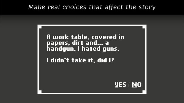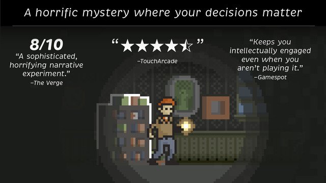 与传统恐怖游戏大肆渲染细腻画面不同。游戏采用了朴素的像素风画面,游戏的恐怖氛围主要通过曲折的故事情节和隐藏的谜题来表现。玩家要根据提示一步步揭开谜题,找到凶手,顺利回到自己家中。 你被一阵暴风雨惊醒,然后睁开眼睛发现你自己身处一个陌生的、漆黑的房间里。当你玩这款游戏的时候,游戏的进展被你的想法所影响,这是一款不同于其他任何类型的恐怖游戏,你将发现事情最后的真想完全由你的主观意识决定。