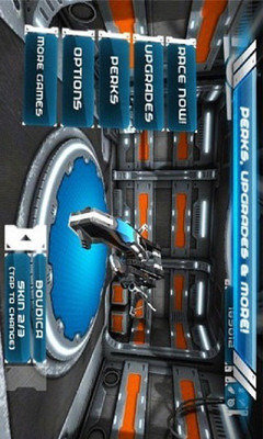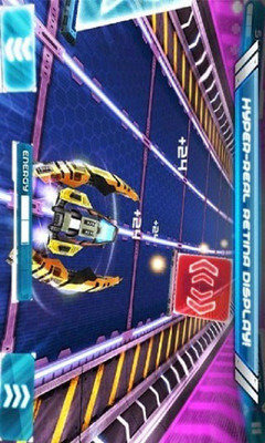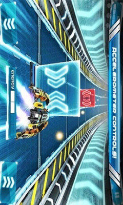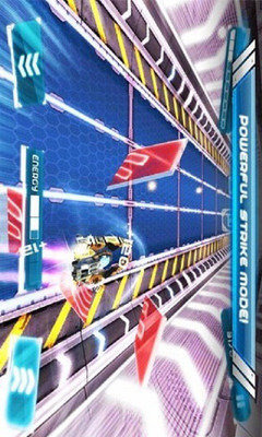 未来派赛车是一款画面非常精美的赛车游戏,各种霓虹光影交错其间的赛道和场景,让人仿佛立刻置身于未来世界中。游戏中你需要一路操控炫酷的战车,收集能量,躲避障碍,并完成游戏各个阶段要求的不同任务。游戏并非竞速类游戏,因为在赛道中你不会遇到对手。赛道中同样有各种障碍赛其中,黄色小点和蓝色箭头是加分,蓝色加号是恢复耐久,而红色的是障碍,必须及时躲避,或开启冲撞模式强行通过。在操控上,游戏采用了重力感应控制方向,再辅以两个触屏按钮,在能量槽满的时候可以使用,功能分别是冲撞模式,速度加快,而且可以冲破前文提到过的红色箭头障碍,或是减速模式,可以更好的操控,以躲避障碍。