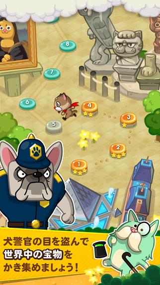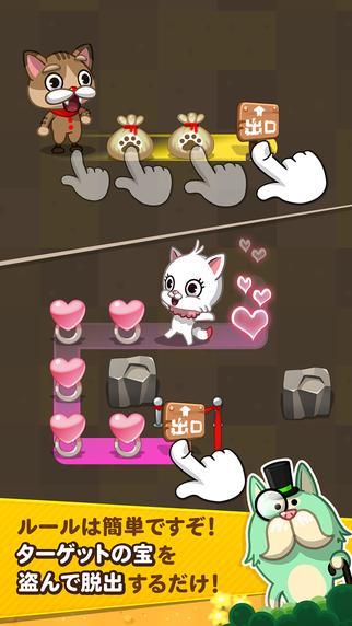 《LINE怪盗猫咪》(LINE 怪盗にゃんこ)是一款益智游戏,玩家在游戏中需要操纵各种各样的猫咪,在关卡之中偷取各国的宝物并帮助猫咪成功地逃离现场。玩家在游戏中需要通过一笔画的方式,将猫咪和终点连接起来,让猫咪在前进的同时偷取沿路出现的宝物。游戏中有多种不同的猫咪出现,玩家可以一一解锁它们。随着游戏的展开,会有更多的伙伴和障碍物登场,对玩家的考验会越来越大。