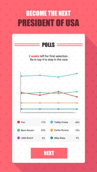 《选举日》(Election Day)是一款画面非常简洁清新以美国选举为题材的趣味休闲类游戏,在游戏中玩家需要控制主角去完成一系列的对战任务。就如同现实生活中的选举一样,在游戏里玩家需要针对各种各样的问题进行回答,并努力赢得公众、媒体和企业的支持。例如移民问题、武器管制等等问题都会出现在游戏中,有时候甚至需要对其他候选人进行评价,稍有不慎就有可能失去民心而竞选失败。喜欢此类游戏的玩家快来下载这款《选举日》体验试玩吧!