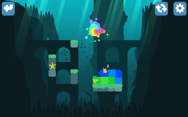 「蛇鹈鸟Snakebird」是一款益智游戏,逻辑上有点像推箱子,需要保证身体上有一小部分在陆地上,否则直接掉水里,走错可以反悔后退。