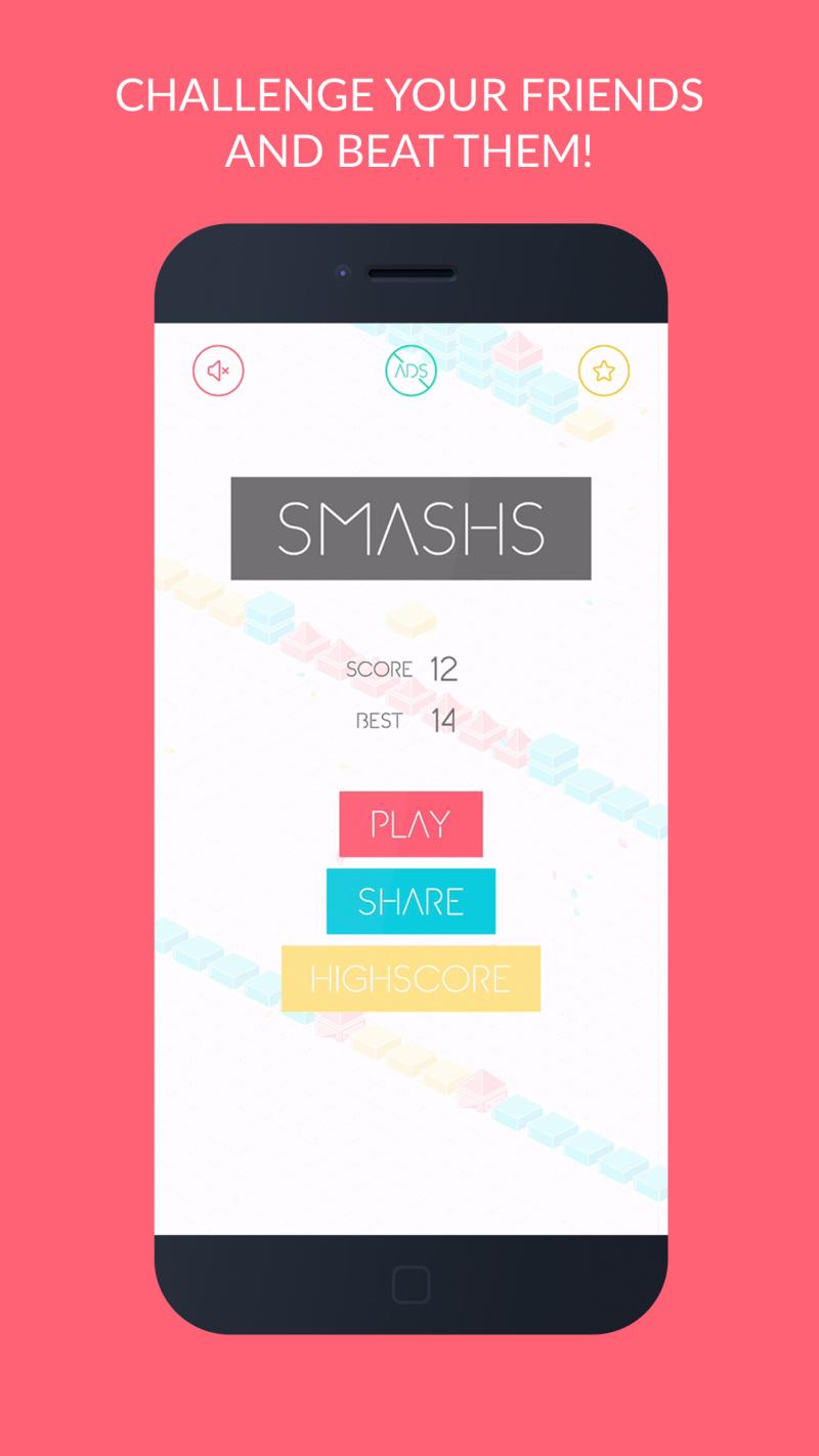 《击碎》(Smashs)是一款休闲挑战游戏,在游戏中玩家的目的就是操纵屏幕中央不停跳跃的小弹珠不断地下落,挑战更深一层的阶梯。每层阶梯上都由红、黄、蓝三色的砖块组成,小弹珠跳到黄色砖块则能将其击碎到达下层,跳到红色尖刺上就GAME OVER了,给人一种刀尖上跳舞的惊险感觉。喜欢此类游戏的玩家快来下载这款《击碎》体验试玩吧!